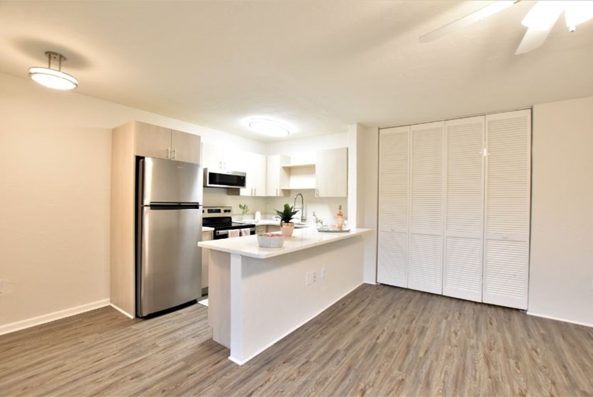 Newly renovated, one-bedroom floor plans provide the style and privacy you have been looking for. Check out the stunning photos of brand-new upgrades at The Hammocks on 34th, complete with stainless steel appliances and modern wood-inspired flooring. The best part? Residents have exclusive access to The Hammocks sister communities’ amenities including a 24-hour fitness center and swimming pools!