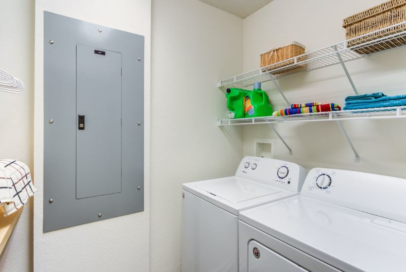 - Every apartment home includes a modern appliance package with a full-size washer and dryer in a separate walk-in laundry area with a folding table and shelving.