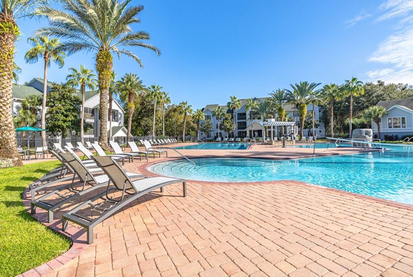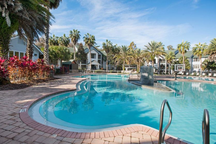 - One of the largest resort-style pools in town with pool volleyball and basketball, a big screen TV, 2 gas grills, waterfalls, and an expansive sundeck with tons of lounge chairs. Enjoy a game of sand volleyball or basketball.