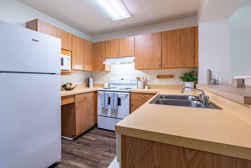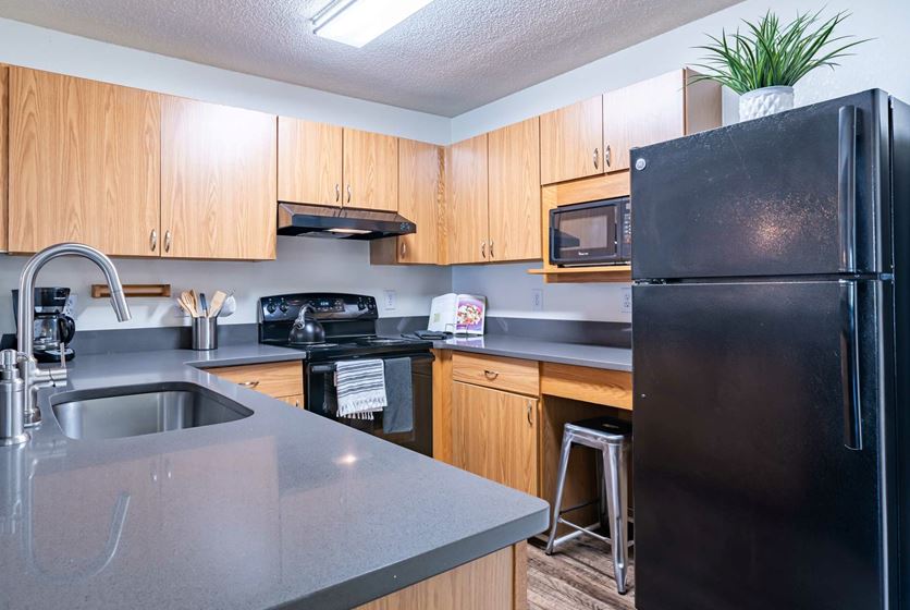 - The kitchens offer plenty of counter space, a pantry, a built-in bar with bar stools, and even come fully equipped with appliances including a microwave and dishwasher. You'll be more than ready to host all the best dinner parties!