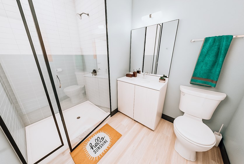 - Wake up and get ready for class in your private bathrooms with stylish ceramic tile, designer custom cabinetry, walk-in showers with Bluetooth showerhead speaker for starting your day off with uplifting tunes or your favorite playlist.