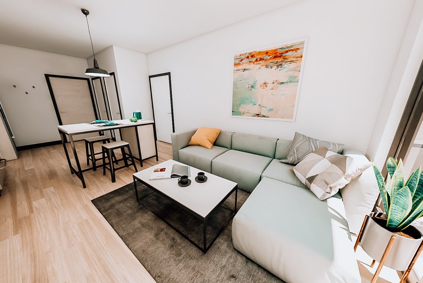 - Live modern and energy efficient with fully furnished custom-designed furniture packages, USB ports in kitchen and bedrooms, a 55" HD flat screen TV in each living room, full-size W/D and luxury finishes including; wood-style flooring, large, openable windows with energy efficient double-plane glass and custom roller shades in living room.