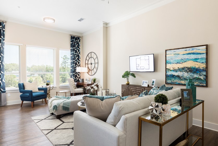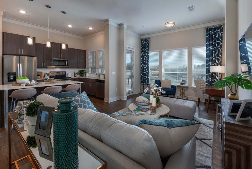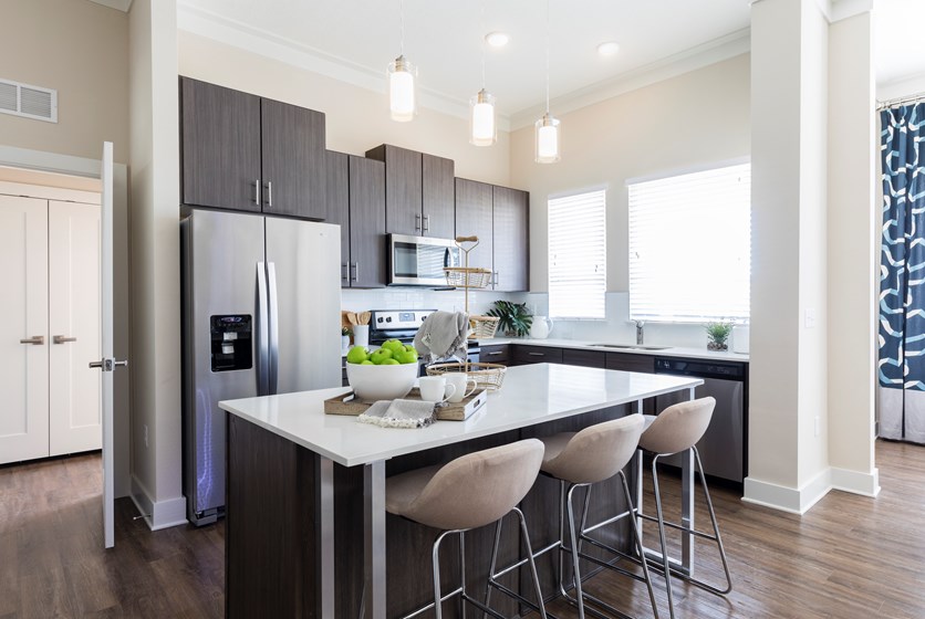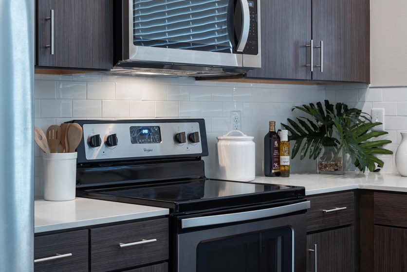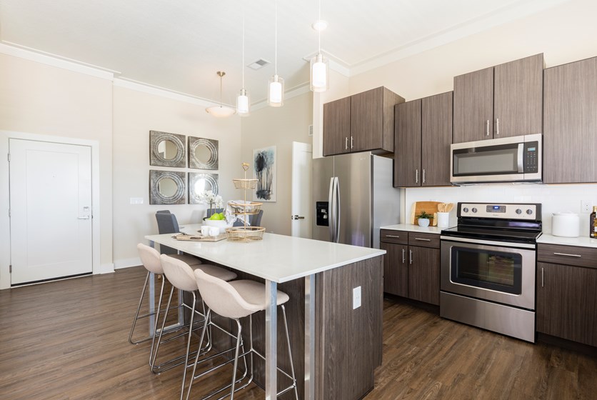 Our 1, 2, and 3-bedroom apartment homes feature modern, stylish interior finishes, full size whirlpool appliances and top-notch amenities including a 24-hour fitness center, business center and resort-style pool and elevators for easy top floor access.