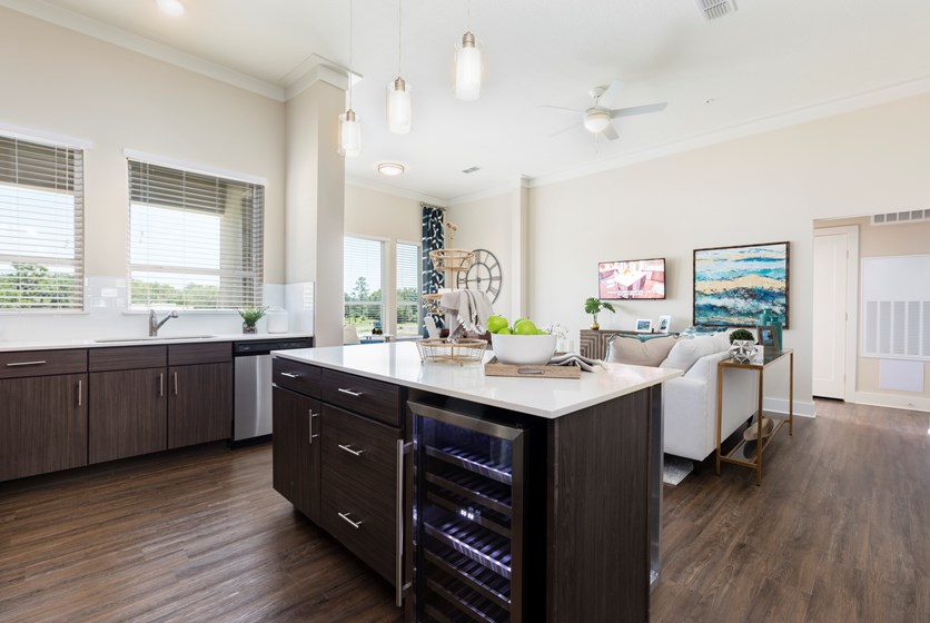- Spacious luxury kitchens provide bright, open-concept living space with beautiful quartz countertops, whirlpool stainless steel appliances, and dual temperature wine cooler. This is the perfect space to host a dinner party or enjoy a morning cup of coffee at the oversized breakfast bar.