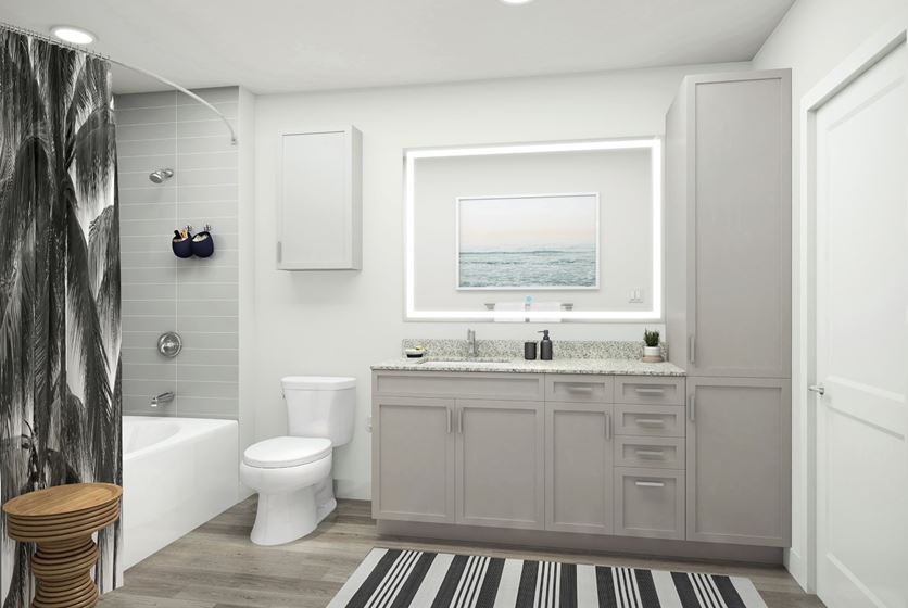 - Be fairest and squarest and get gameday ready in style! Each roommate has access to their own spacious, well-lit bathroom complete with roomy modern cabinetry and granite counter space for storing products, hair tools and cosmetics. Fog-control, LED mirrors feature built in speakers! Your four-legged pal can get pampered too at the onsite Pet Spa - no dog hair cleanup required!