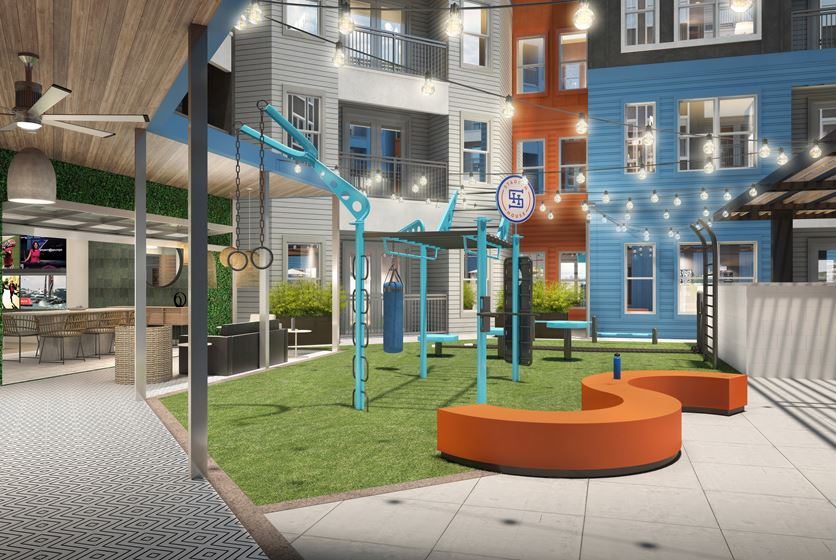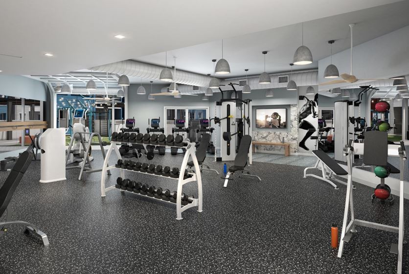 - Power through your workouts in the state-of-the-art fitness center complete with gym squat racks, free weights, virtual training! Fitness center connects with outdoor Crossfit courtyard and yoga lawn.