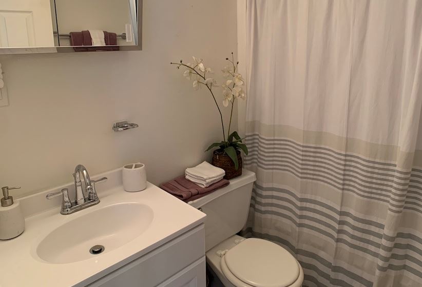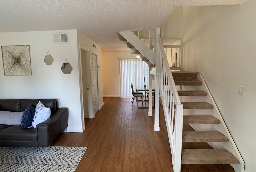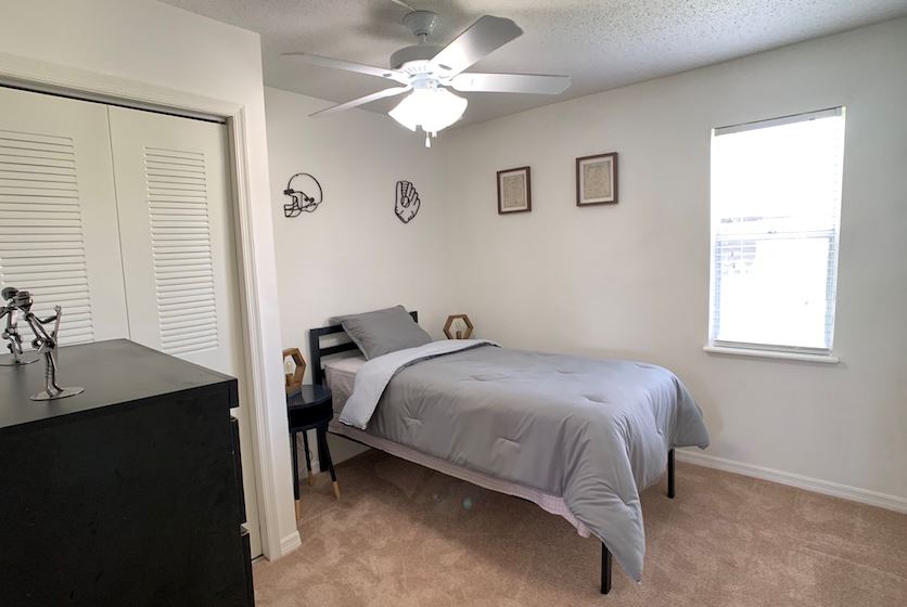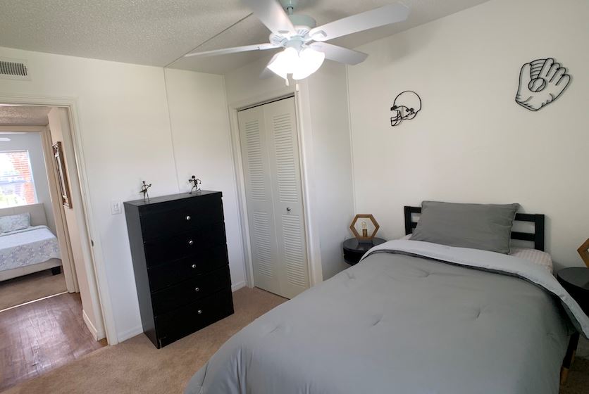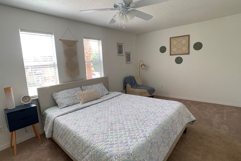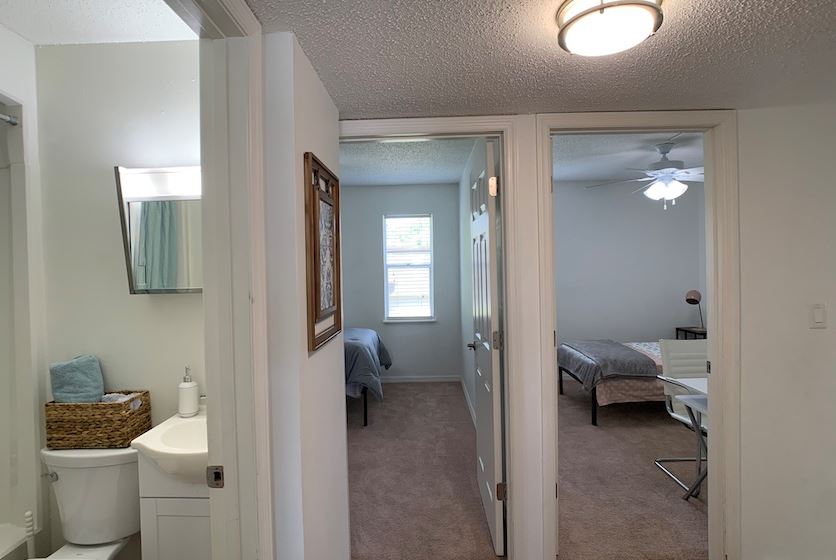 - Spacious, open floor plan design with hardwood floors, full-sized beds, private bathrooms, ceiling fans, walk-in closets.